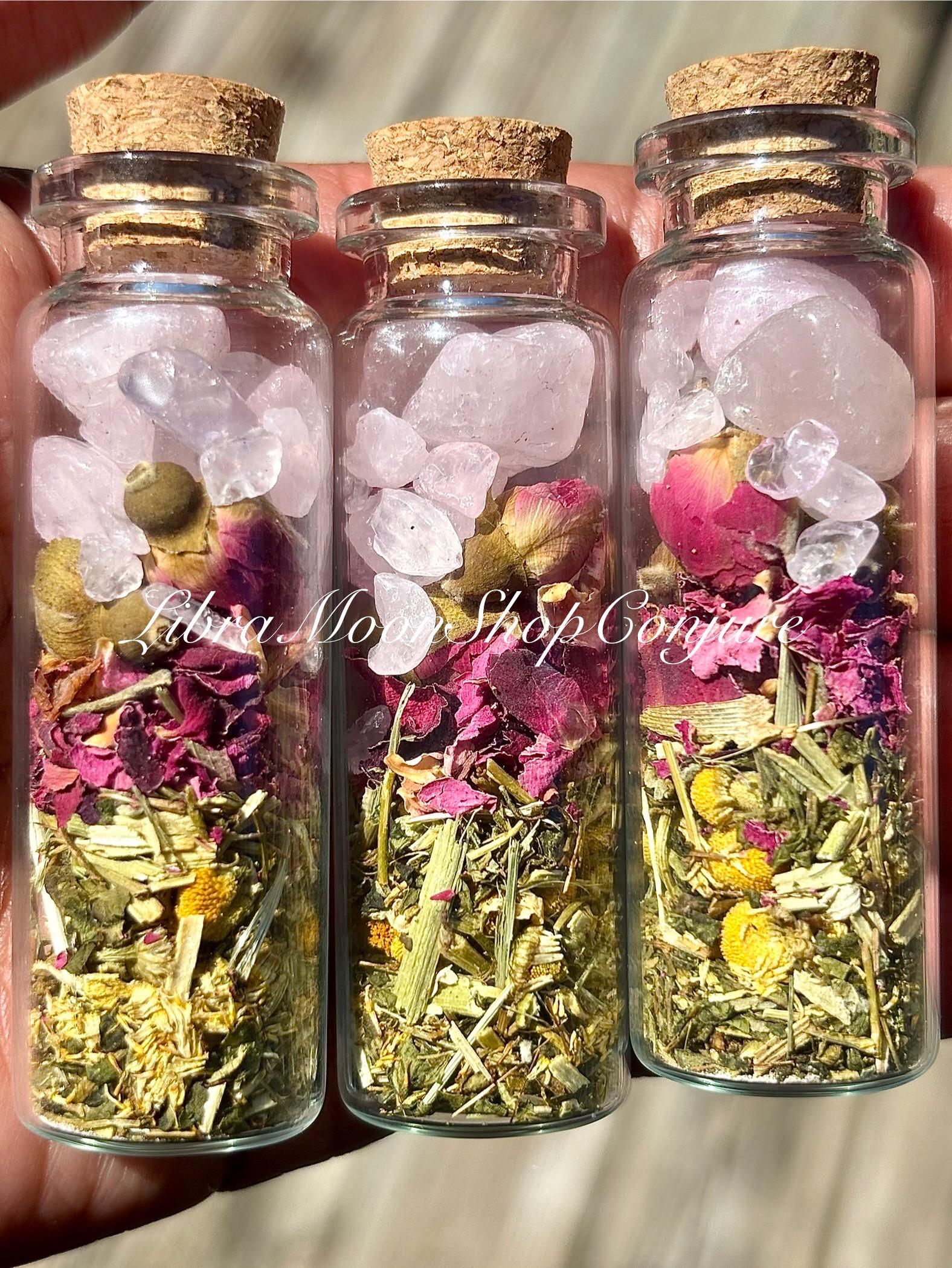 Jars are made with Passion Flower, Lavender, Rose buds and Rose Quartz crystals.